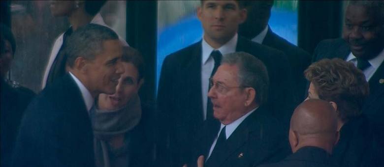 Obama e o cubano Raúl Castro se cumprimentam em Soweto, na região de JohannesburgoSABC via Reuters TV